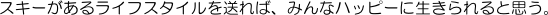 「スキーがあるライフスタイルがあれば、みんなHappyに生きられる。」をモットーに、海外で培った経験を踏まえたスキーレッスンやパウダーガイディングを行う一方、日本のスキーヤーに向けて、新しいスキースタイルを提案している。